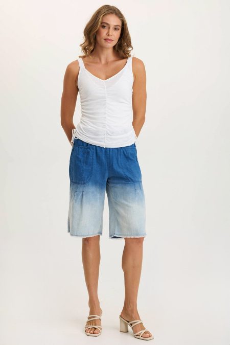 115.00$A lightweight denim alternative, Themia sports interesting seaming and pleats throughout its clean, pull-on waist silhouette. Indigo Twill: 85/15 Cotton/Linen Indigo Jersey Waistband: 95/5 Cotton/Spandex Inseam (~in): ~14″ Front Rise (~in): ~11″ Back Rise (~in): ~17″ Waistband: 2.25″ Elastic in Jersey Waistband Color Description: Ombre Acid Wash Effect Preshrunk Machine…