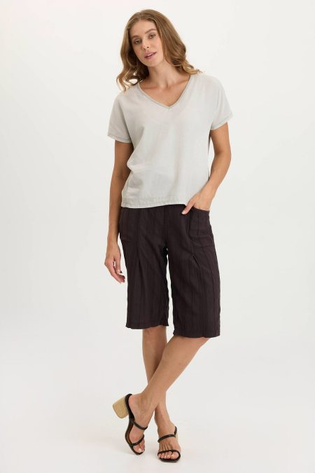 100.00$A drawstring elastic waistband makes this pinstriped linen longline short a must-have for Spring. Zippered cargo pockets on either side amp up the novelty. Tandem Stripe Linen: 40/33/25/2 Linen/Rayon/Nylon/Spandex 2×1 Rib Waistband: 95/5 Cotton/Spandex Inseam: ~24.5″ Front Rise: ~11″ Back Rise: ~17.25″ Waistband: Elastic Color Description: Cool Classic Khaki Preshrunk…