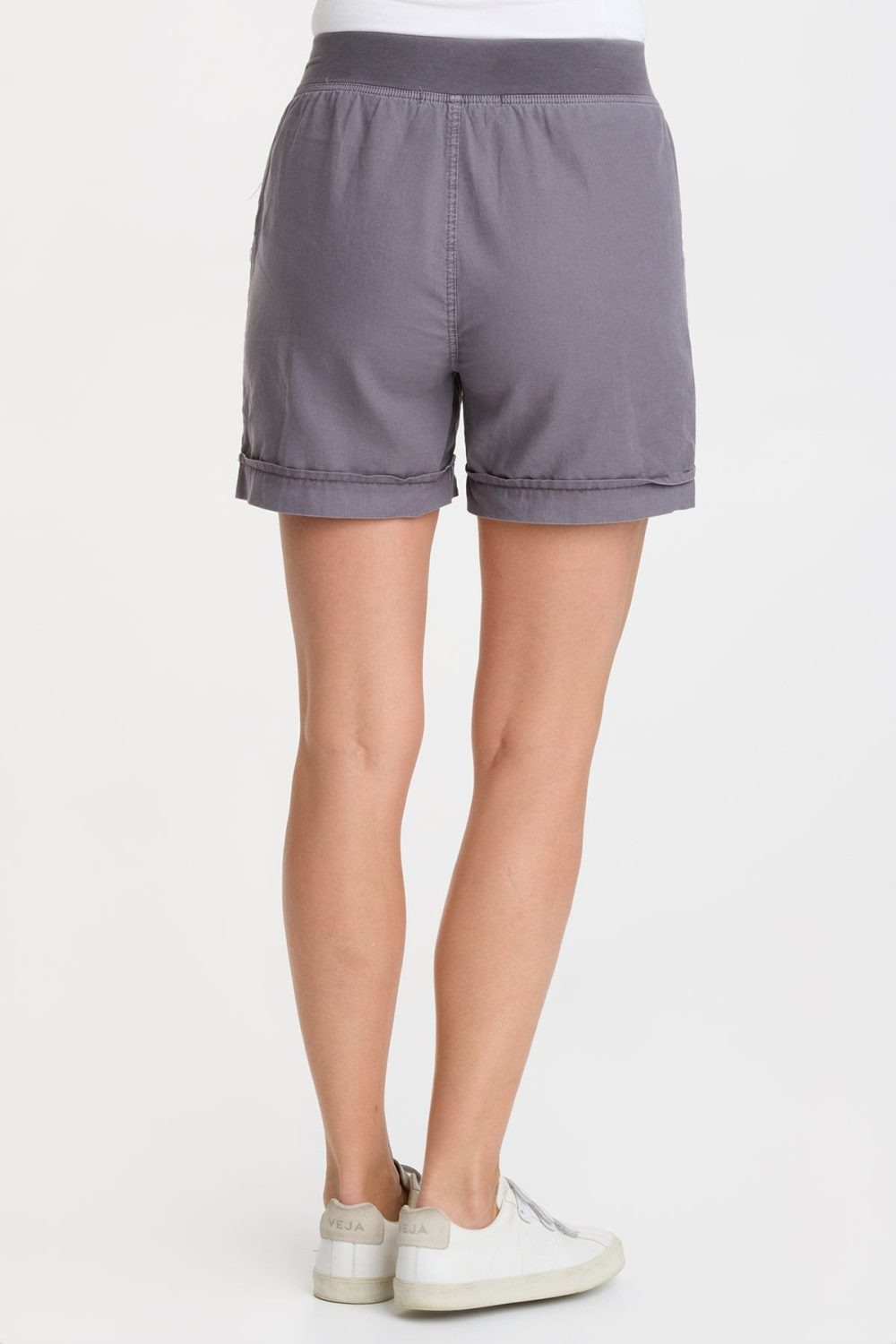 Brass ring snaps are featured on two mini cargo pockets and side seam tabs. With a high waist cut and an elastic waistband, this classic cotton linen short is a must for your seasonal update!