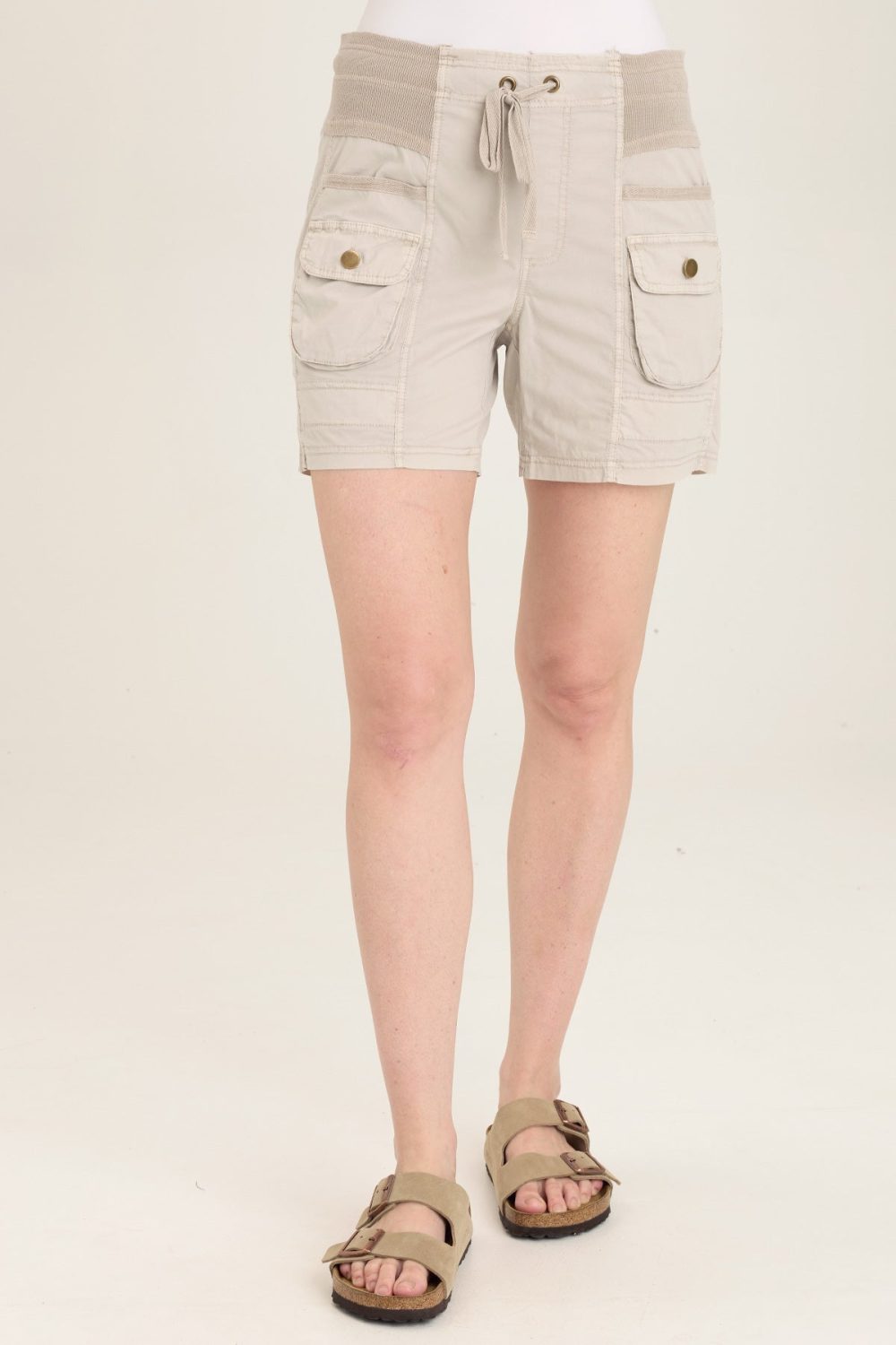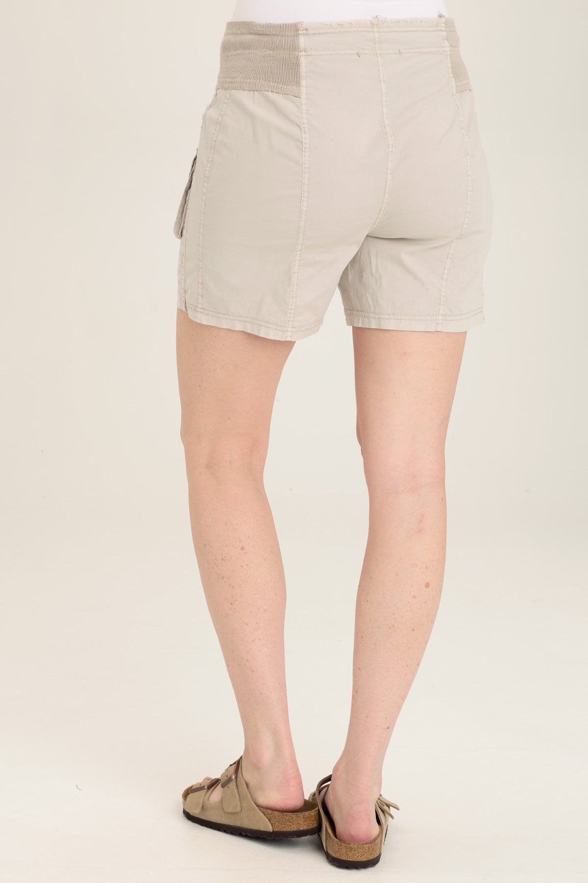 This classic poplin drawstring-waist short features a raw-edge contrast ribbed waistband, twill tape details, and cargo pockets with flat snaps.