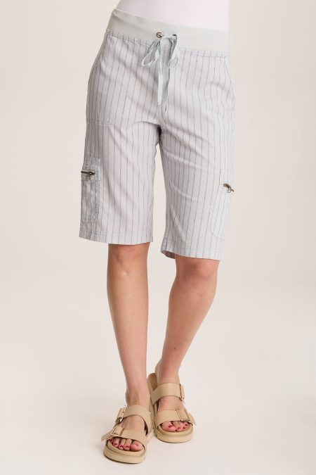 This classic poplin drawstring-waist short features a raw-edge contrast ribbed waistband, twill tape details, and cargo pockets with flat snaps.